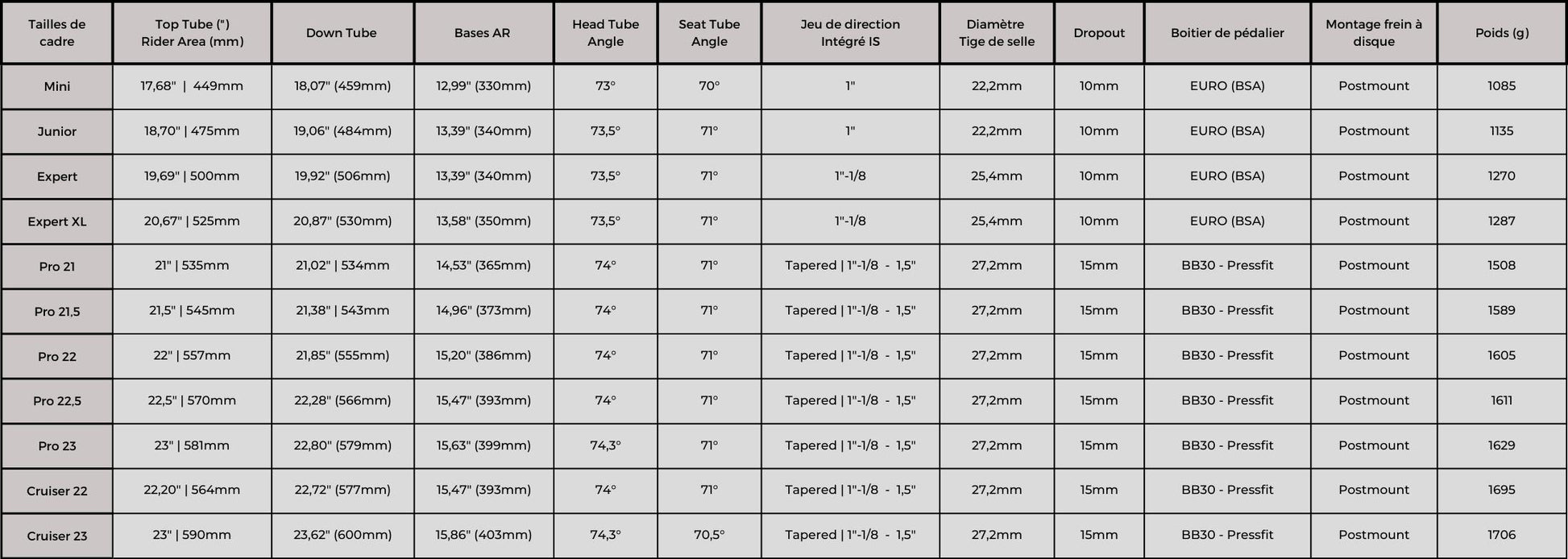 Colonne de direction : 1" (Mini, Junior) | 1"-1/8 (Exp & Exp XL) | 1"-1/8 ; 1,5" tapered (tailles Pro et Cruiser)