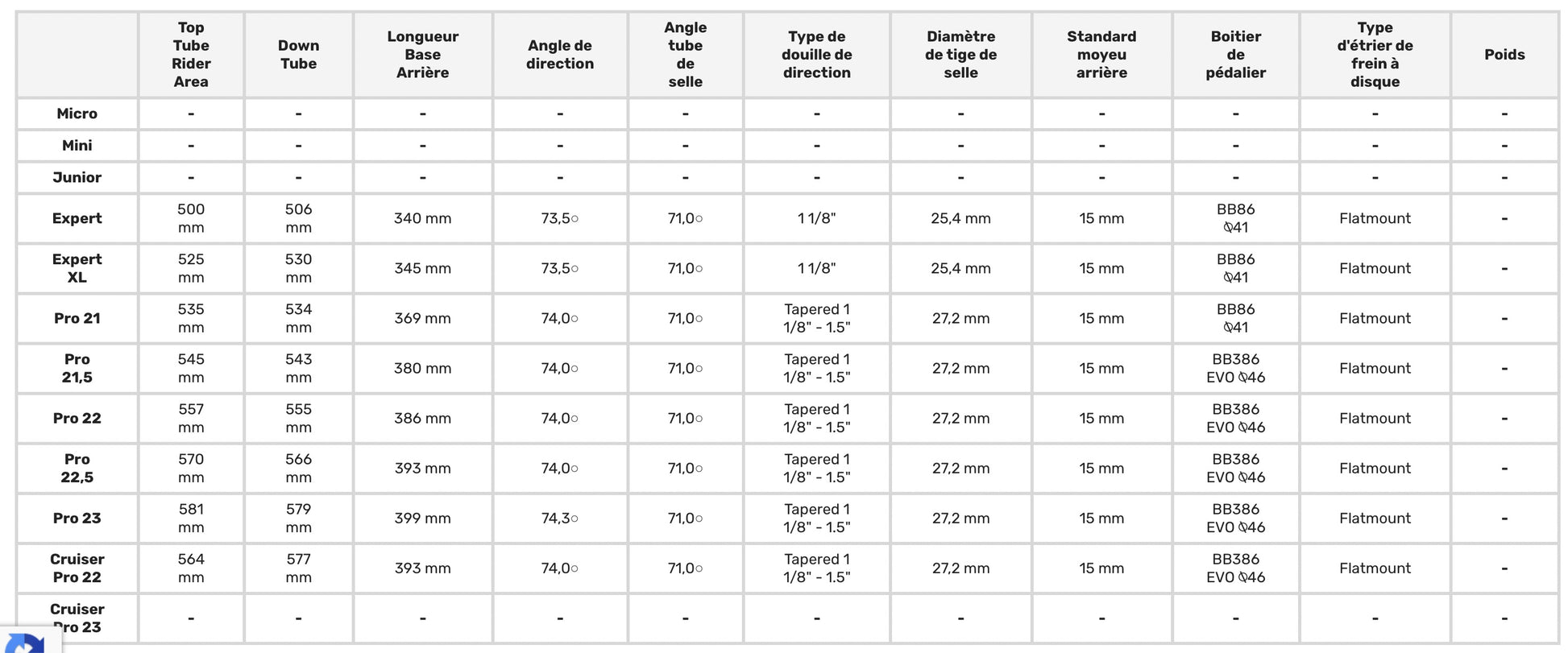 - Boîtier de pédalier BB86 ou BB386 selon les tailles - voir le tableau ci-dessous