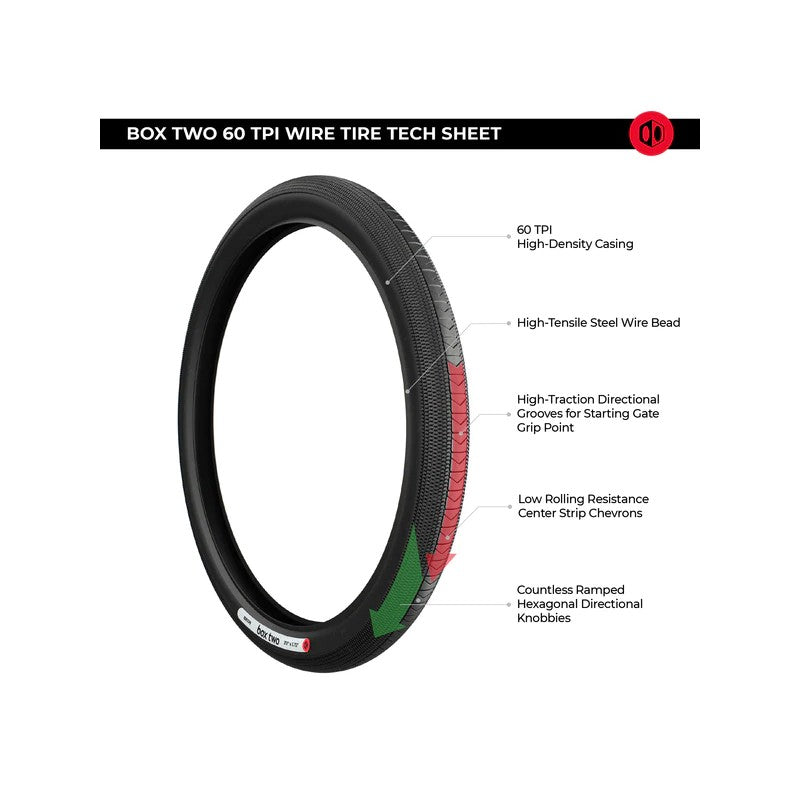 Les pneus à tringle métallique Box Two ™ 60 TPI ont été conçus avec une approche minimaliste pour atteindre des objectifs ambitieux en matière de poids, de traction, de résistance au roulement et de rebond. En son cœur se trouve un flan 60TPI super souple dans lequel nous avons forcé autant de nylon que possible pour remplacer le caoutchouc. Les flans fins sont utilisées pour réduire la traînée et réduire davantage le poids. Tringles hautes densités en acier haute résistance. Bande de roulement spécifique à la course BMX qui passe d'une bande centrale avec une grande surface de contact à des crampons tactiles directionnels sur les côtés. Cette combinaison agressive permet une traction maximale hors de la porte, une immense adhérence dans les virages et une faible résistance au roulement dans les lignes droites. Un mélange de composés à la pointe de la technologie est utilisé dans diverses zones..